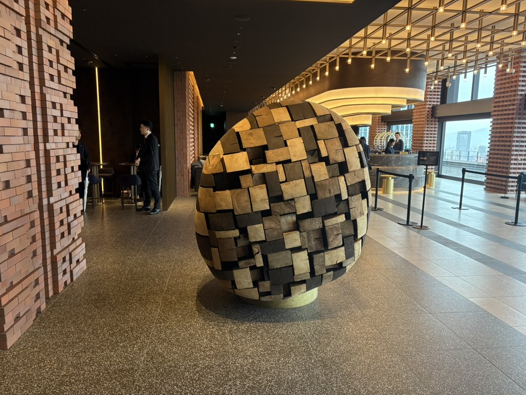 ロビーフロアは29階にあり、フロアの前にはオブジェがお出迎え。全体的に落ち着いた色味でリラックスした印象